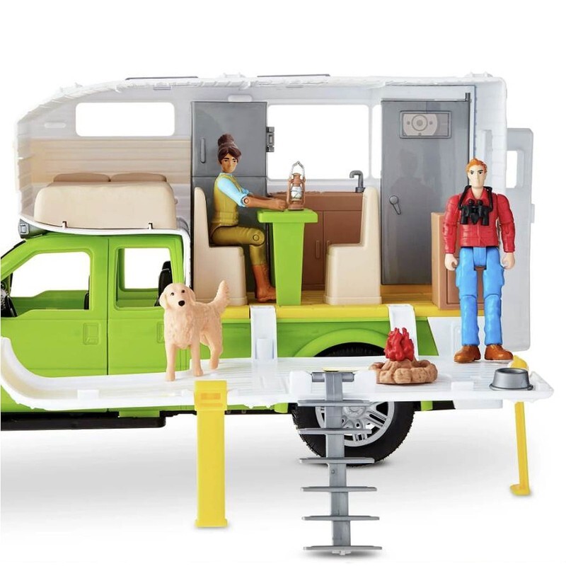 8-piece adventure set featuring a Ford F-350 truck with working lights and sounds (batteries included) Includes 2 poseable action figures, a loyal dog, lantern, binoculars, campfire, and feeding bowl Truck doors open and the side wall folds down for easy play access Interior features a cozy sleeping bed, kitchen stove, refrigerator, restroom, cabinet, table, and two chairs Press the steering wheel to activate lights and sounds for interactive fun Sounds include several fun phrases to boost imaginative storytelling and roleplay Officially licensed Ford truck for realistic play Great for both indoor and outdoor adventures Encourages imaginative storytelling?perfect for solo or group play A thoughtful and exciting gift for kids and families Designed for children ages 3 and up (contains small parts)