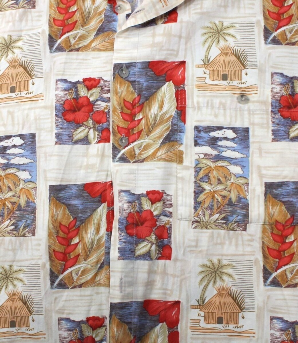 Step into paradise with this vintage Pierre Cardin Hawaiian shirt. Crafted from 100% cotton, this shirt offers both comfort and style. The vibrant red floral and scenic prints on a beige background make it a standout addition to any wardrobe. Embrace tropical vibes daily.
