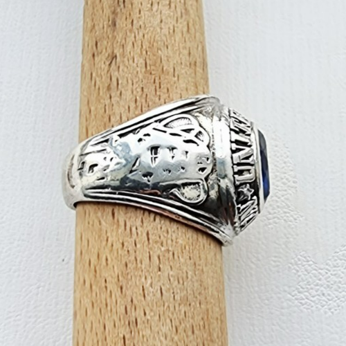 This vintage men's 925 sterling silver ring features a United States Navy blue stone set in a bezel style setting. The ring is signed by the brand Pride and has a ring size of 10. Made in the United States with sterling silver as the base metal, the main stone shape is oval and the band width is 7 mm. Add a touch of beauty to your jewelry collection with this unique and historic piece.