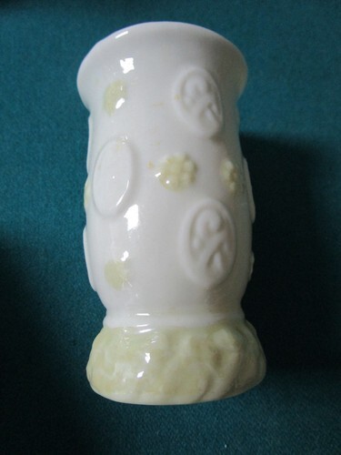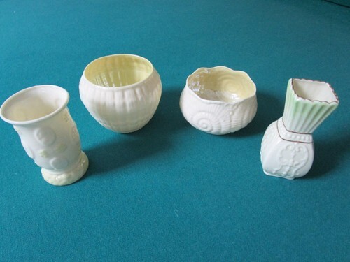BELLEK LOT 2 BOWLS 2 VASES GREEN STAMP BOWLS ARE 3 1/2 ", VASES 3 1/2 ONE BOWL HAS A SMALL CHIP 81B-BASKTRACK6