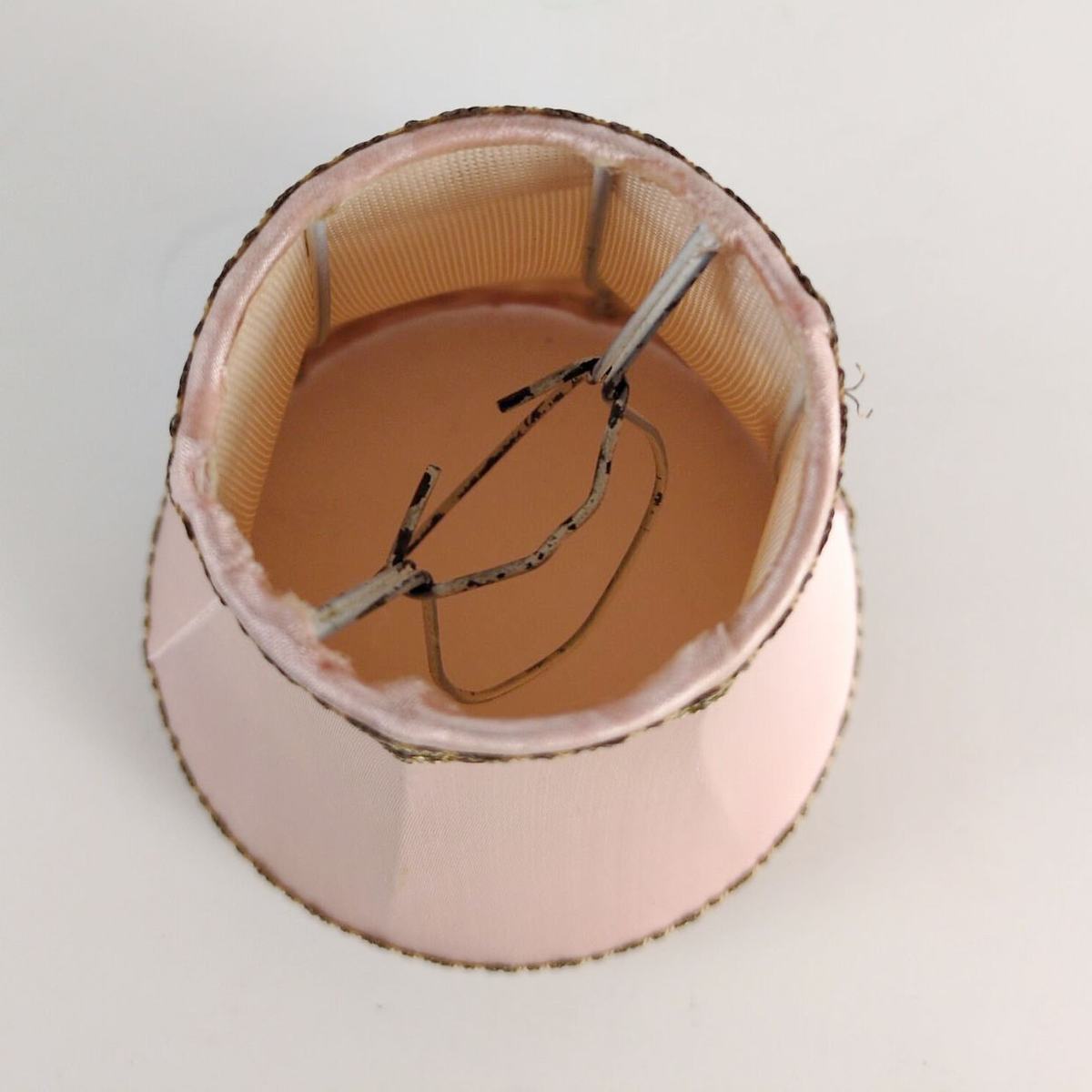 This vintage lampshire features a fabric satin cover in pink, gold lace trim and painted white metal clip-on. It measures 4.5" tall, 4.5" diameter base, 2.25" diameter top. Metal wire framed. No maker or origin indicated.