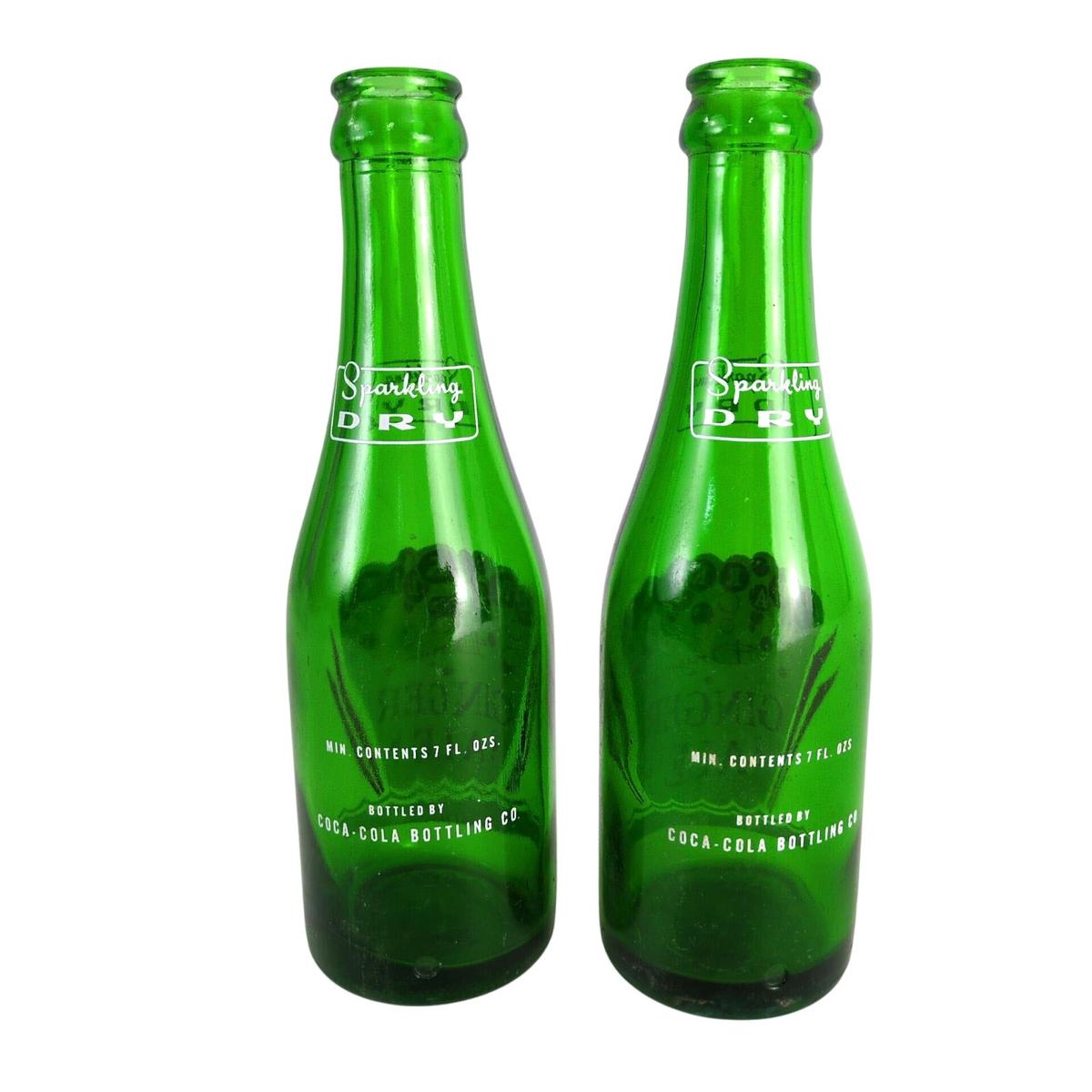 2 Vtg 1950s Sparkling Dry Ginger Ale ACL 7oz Green Glass Soda Bottles Coca-Cola