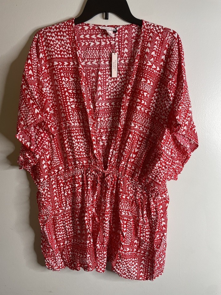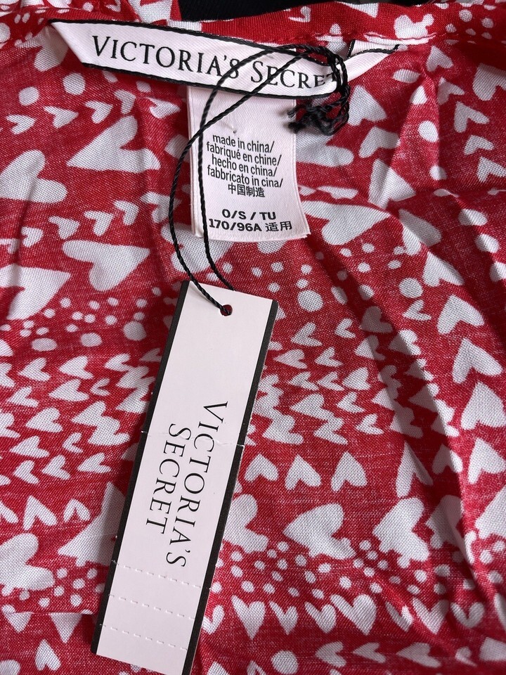 Indulge in romantic comfort with this Victoria's Secret kimono robe. Crafted from lightweight viscose canvas, this bohemian-style robe features a heart-printed pattern in red and white. The tie-front closure and V-neckline add a touch of elegance, while the short sleeves keep you cool during summer, fall, or spring.