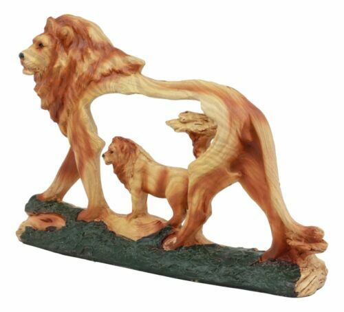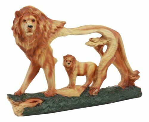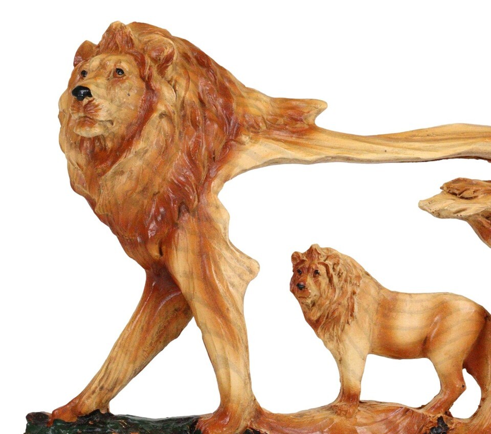 ? Decorate your desk or shelves with this beautiful wood look alike King of the Jungle Lion sculpture. Our sculptors transform the resin medium into a wood grain looking sculpture of a lion with a carved body.