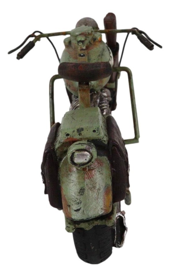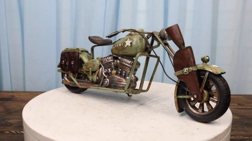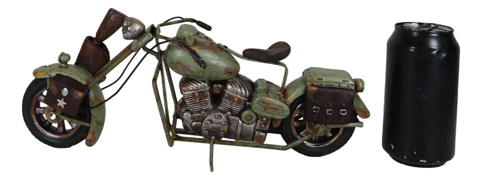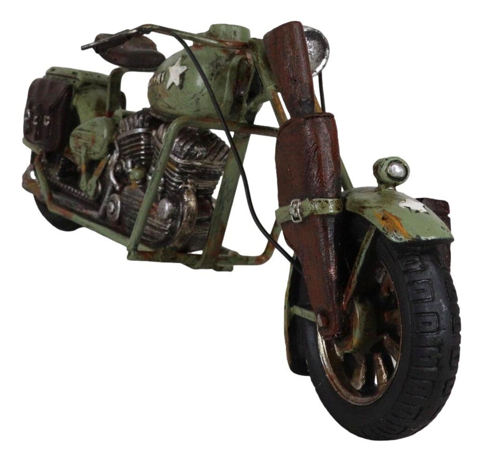 ? If you love riding choppers across town, then this sculpture will be dear to your heart! A vintage take of the classic chopper bike, this sculpture is painted with the US army camo motif. It is an exquisite accent for your desks, shelves, mantelpiece or what have you!