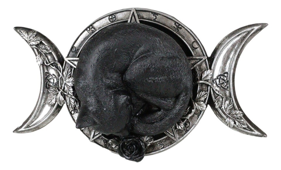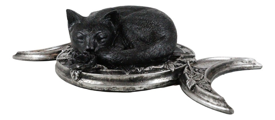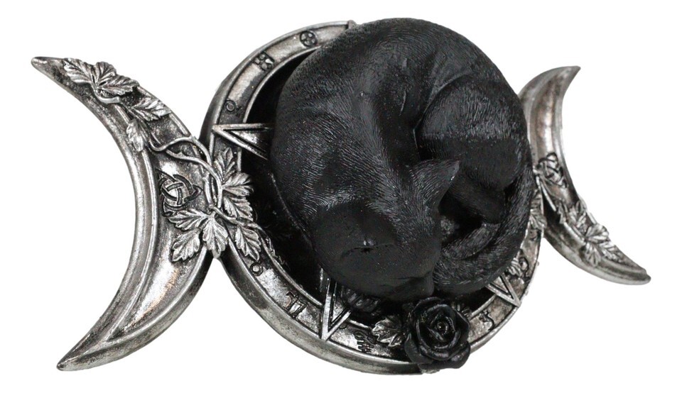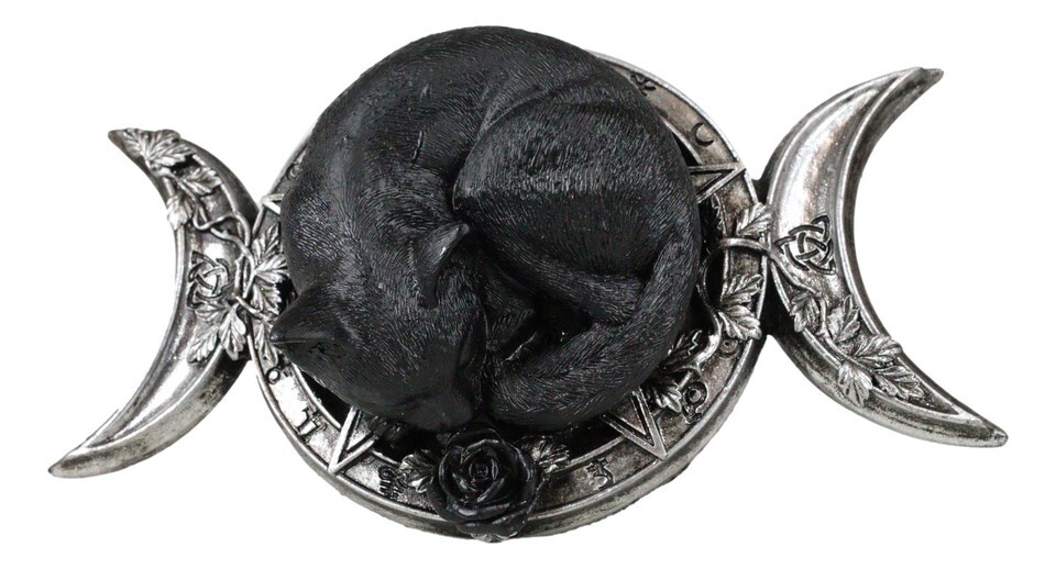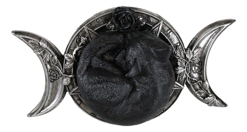 Wicca Witchcraft Triple Moon Insignia With Sleeping Black Cat And Rose Figurine