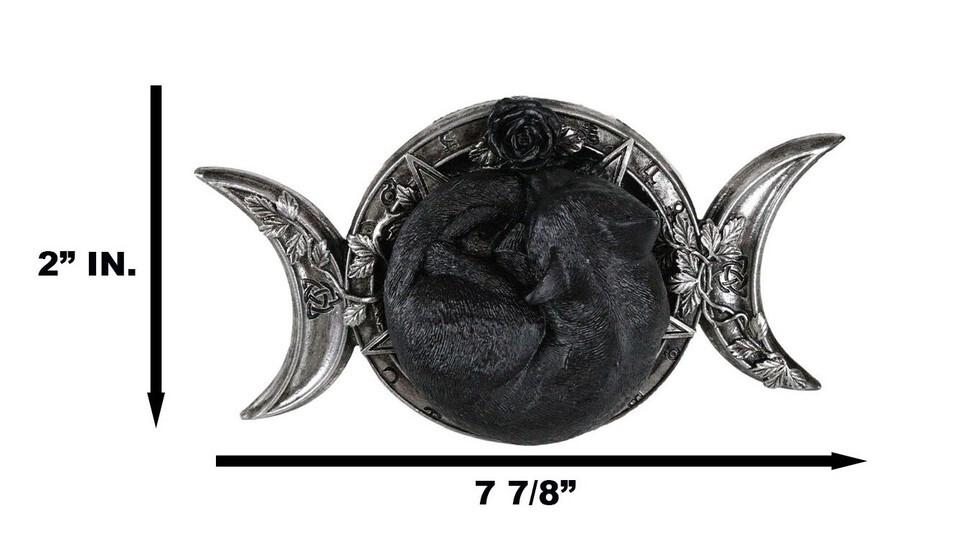 ? This triple moon with black cat figurine measures 2" tall, 8" wide and 4.5" deep approximately. The sculpture weighs about 1 pound.