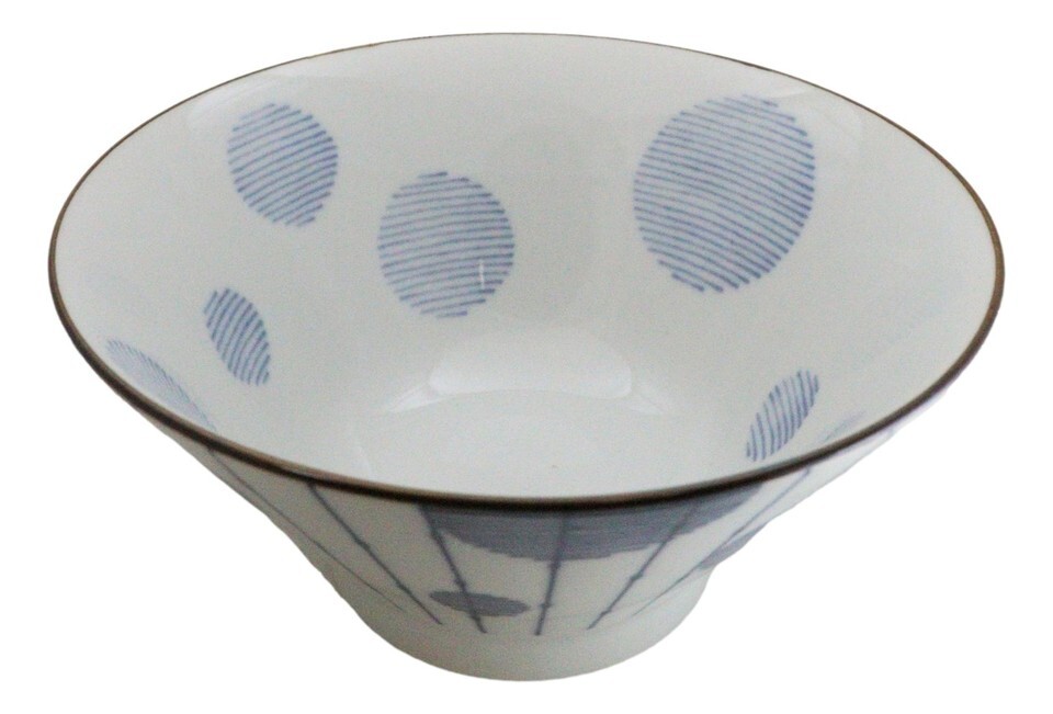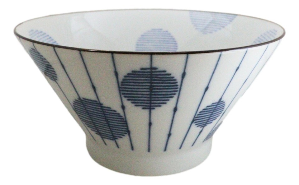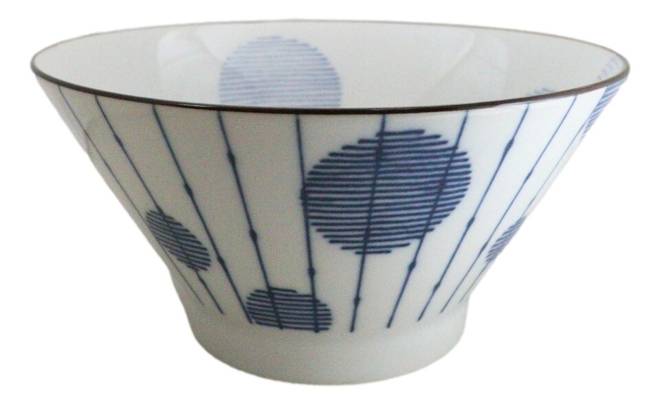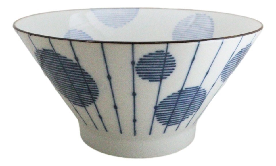 ? This sorigata bowl is decorated with an aizome blue pattern inspired by long-growing reeds, with additional Fukizumi "Polka-dot" detailing, reminiscent of the work of famous Japanese artist Yayoi Kusama. Its' extended base not just prevent users' fingers from getting burnt when serving hot dishes, but also offsetting the bowl from a table setting and protecting the porcelain surface.