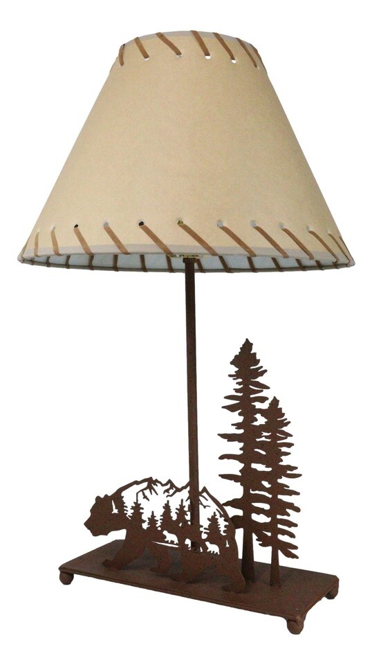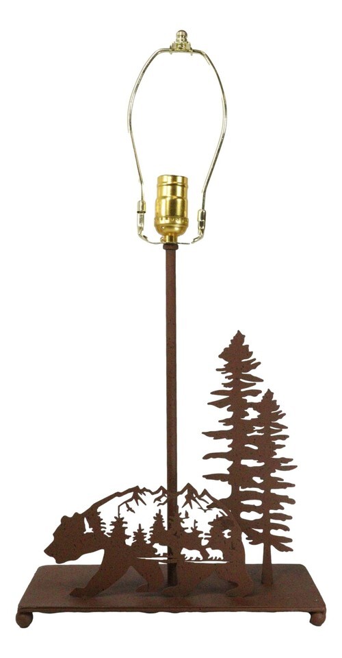 ? Illuminate your space with our Western Country Black Bear in Pine Forest Meadow Metal Table Lamp. This beautifully designed lamp features a striking black bear scene surrounded by lush pine trees, bringing the charm of the outdoors into your home. Crafted from cast iron, it combines functionality with a rustic aesthetic, making it perfect for bedside tables, living rooms, or cozy nooks. Embrace the spirit of nature and add a warm glow to your decor with this eye-catching lamp!