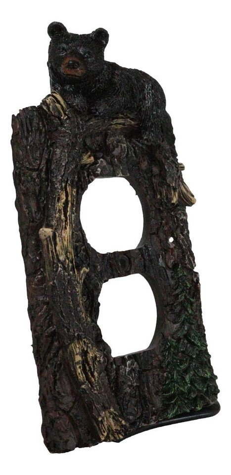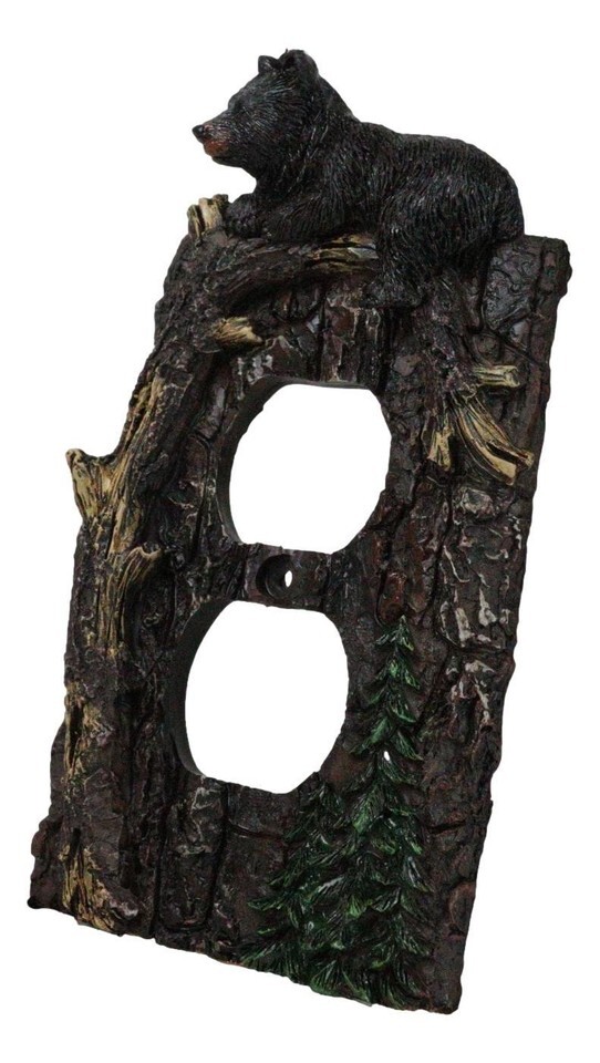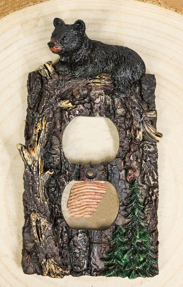? It is now very easy to transform your space at your home or office into a rustic Western exotic getaway with these black bear family electrical cover plates. This particular electrical plate cover features 2 black bears climbing up a tree trunk and branch. With a touch of greenery and woodsy brown texture, this wall plate exudes rustic western flair.