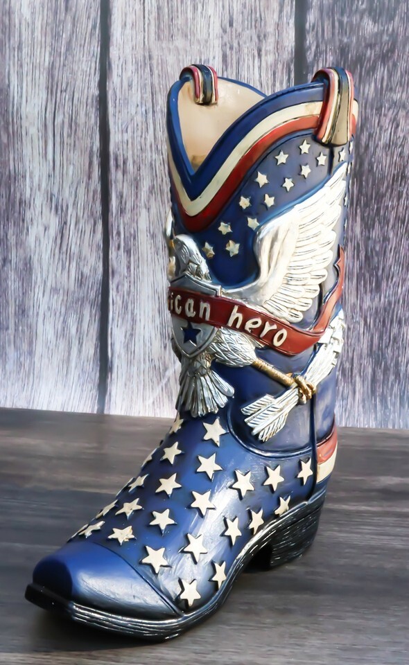 ? Add some flair to your home with this awesome vase/tabletop accent. Intricately detailed, the cowboy boot features the majestic bald eagle, western stars and the word american hero. Use it as a vase for your plants/flowers, or as planters or even as a holder for your larger painting brushes. The possibilities are endless when you put your Wild Wild West imagination to work!