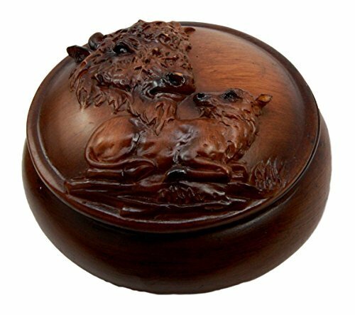? Look for a rustic and exotic jewelry holder or other knick knack holder? This rounded faux wood resin box will do the job perfectly!!! On its surface is a carving of a wild buffalo with his mate in a nature setting.