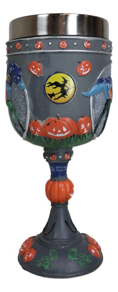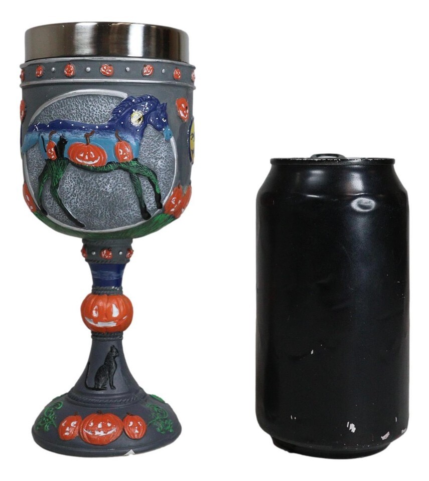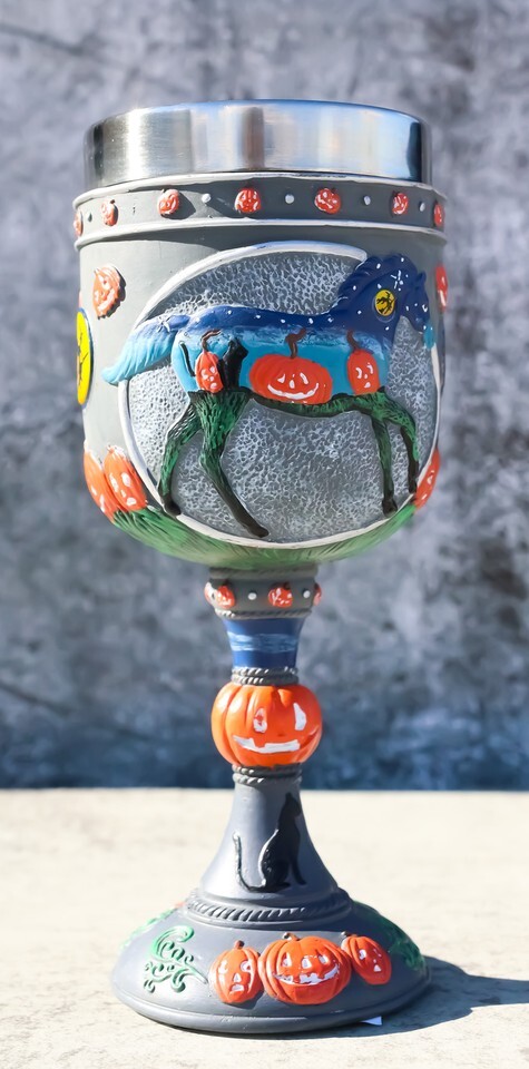 ? A touch of autumn magic for any horse lover! This goblet features a stainless steel insert for easy drinking and cleaning. Around the outside is a scene of a pumpkin patch themed horse, and more jack-o-lanterns. The spooky vessel makes an excellent Halloween gift!