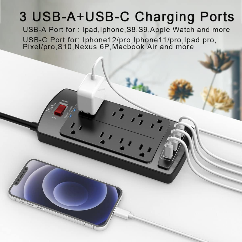 2 Special design widely spacing AC outlets(1.8 inches) for large adapters and 6 standard spacing outlets, meet all your charging requirements for home, office, kitchen appliances like TV, speakers, DVD, computer, laptop, printer, lamp and more.