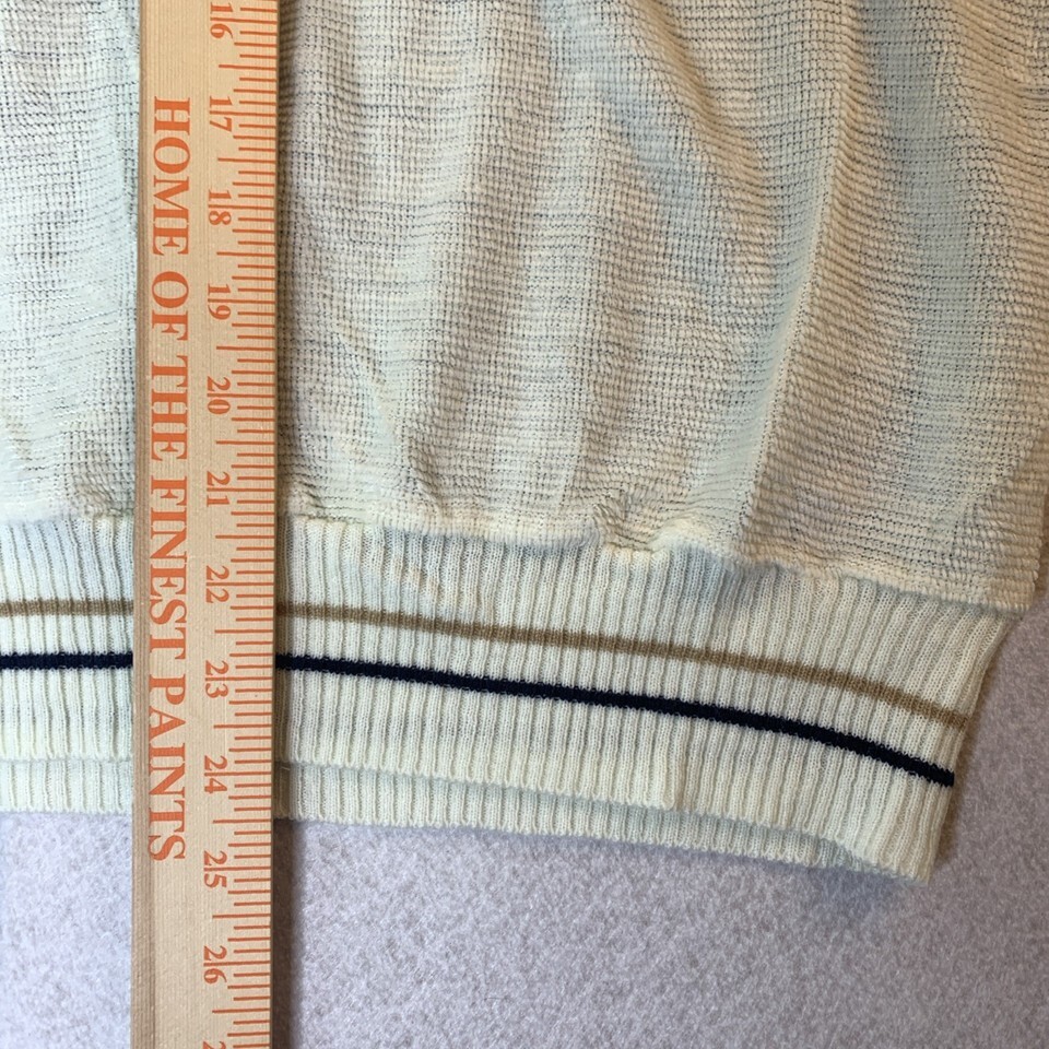 The VTG Saturdays California Men's Polo Shirt in size Large features a classic blue, white, and tan striped pattern, short sleeves, a collared neckline with a button closure, and a regular fit. Made from lightweight acrylic fabric with a woven design, this vintage polo is perfect for all seasons and can be worn for activities like walking, beach outings, or golf. The retro design and California theme make it a stylish and versatile addition to any man's wardrobe.