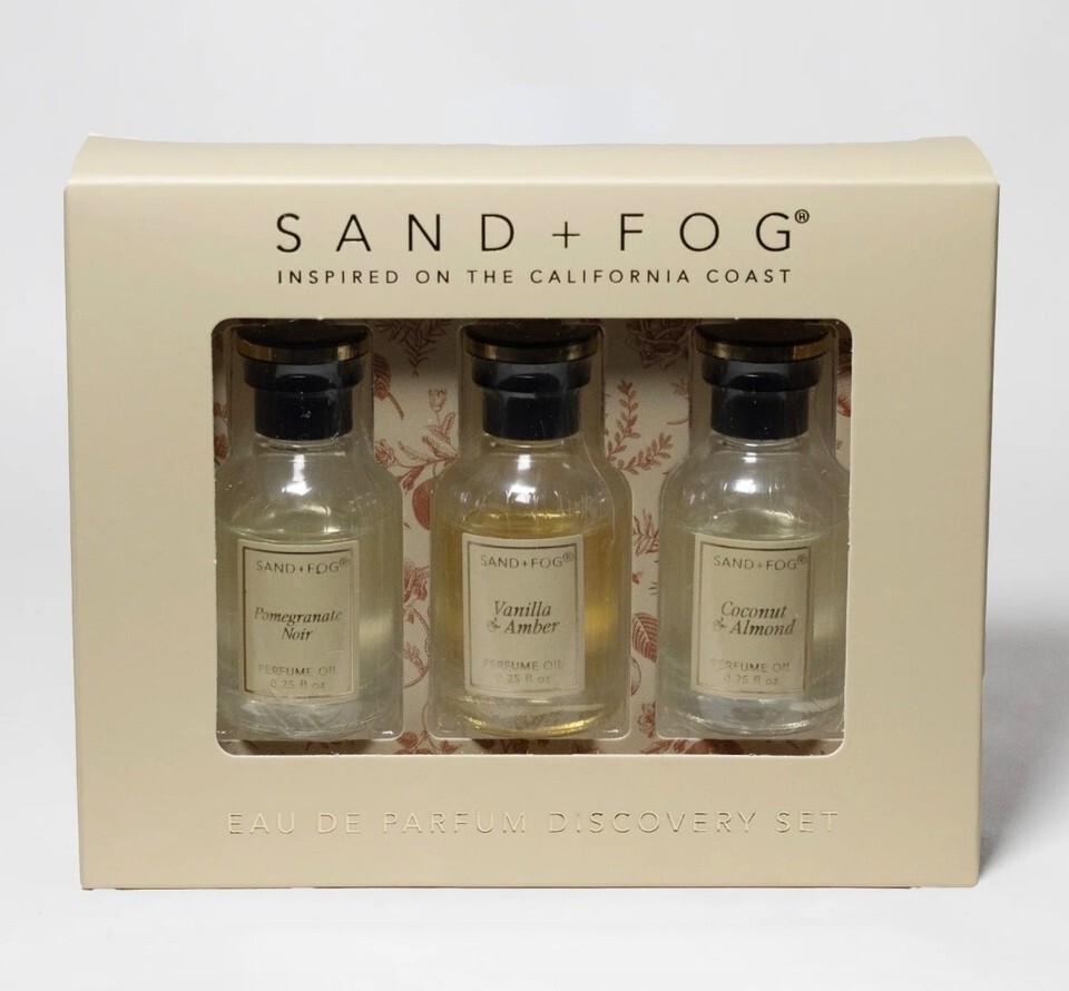 Brand new in box Sand Fog set of 3 perfume oils. Pomegranate Noir, Vanilla Amber, and Coconut Almond. Dauber bottles