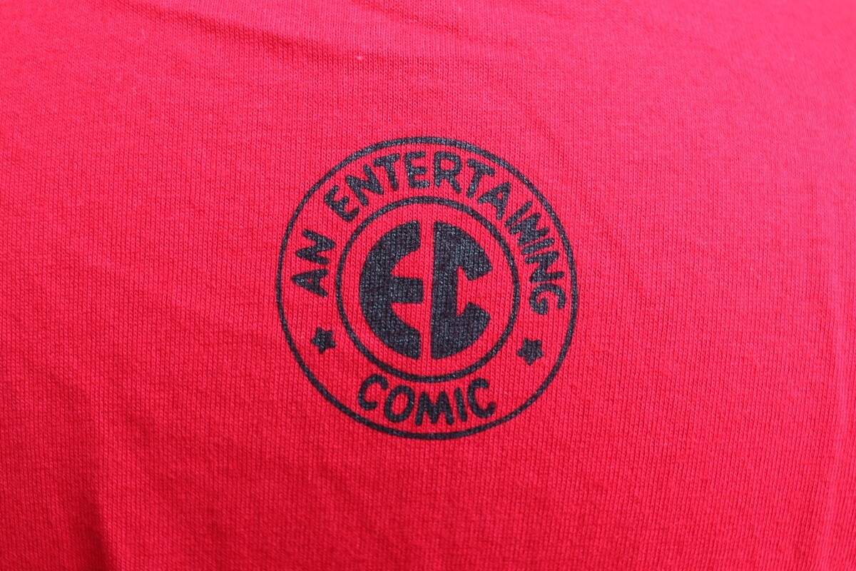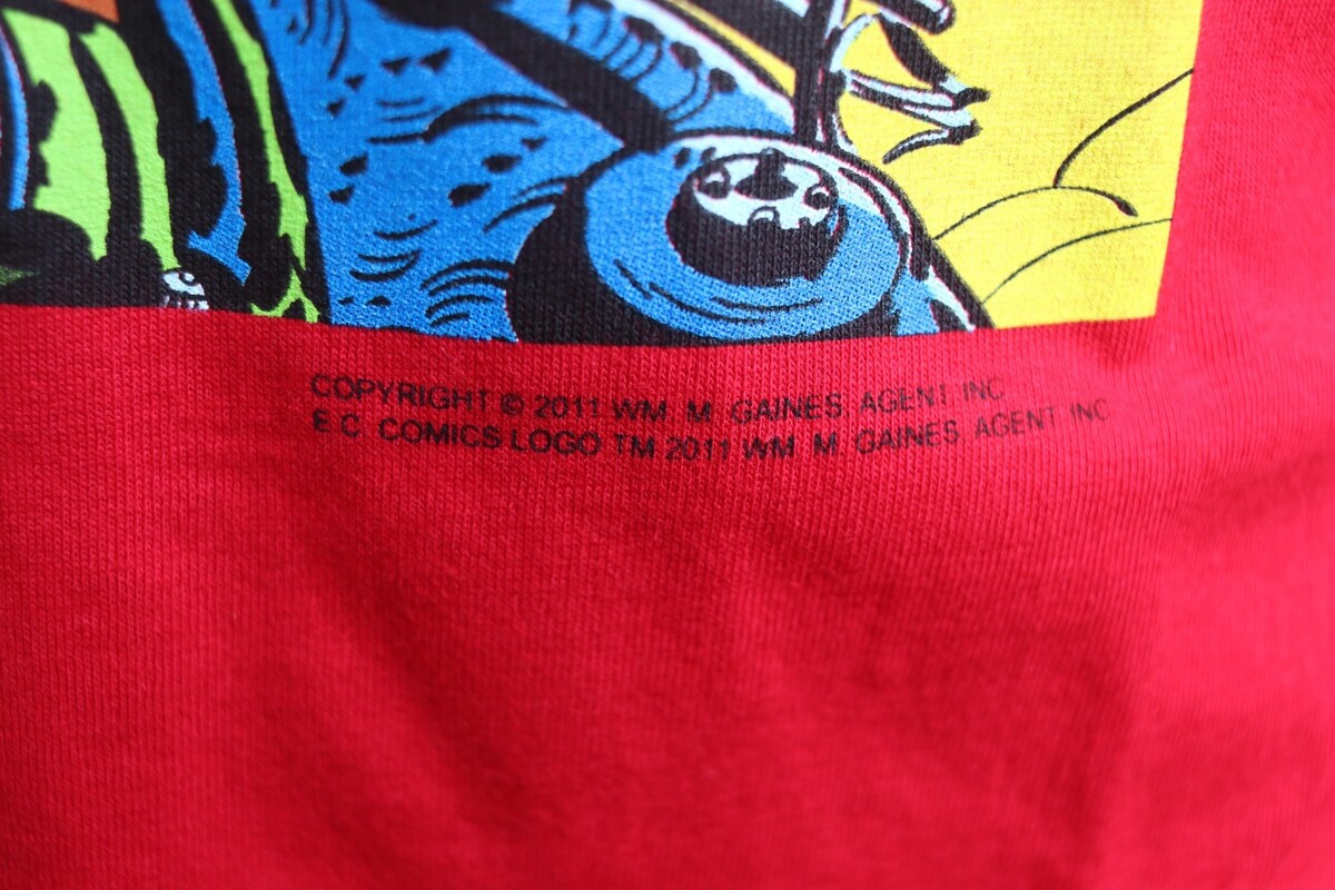 The NOS Vintage 2011 EC Comics TWO-FISTED TALES Graphitti T-Shirt is a multicolor, short-sleeve tee featuring a design by Graphitti Designs. Available in multiple sizes, this unisex-adult shirt is perfect for fans of classic EC Comics looking to show off their love for the iconic TWO-FISTED TALES series. Made for regular fit, this shirt is a must-have for any collector or enthusiast looking to add a unique and nostalgic piece to their wardrobe.