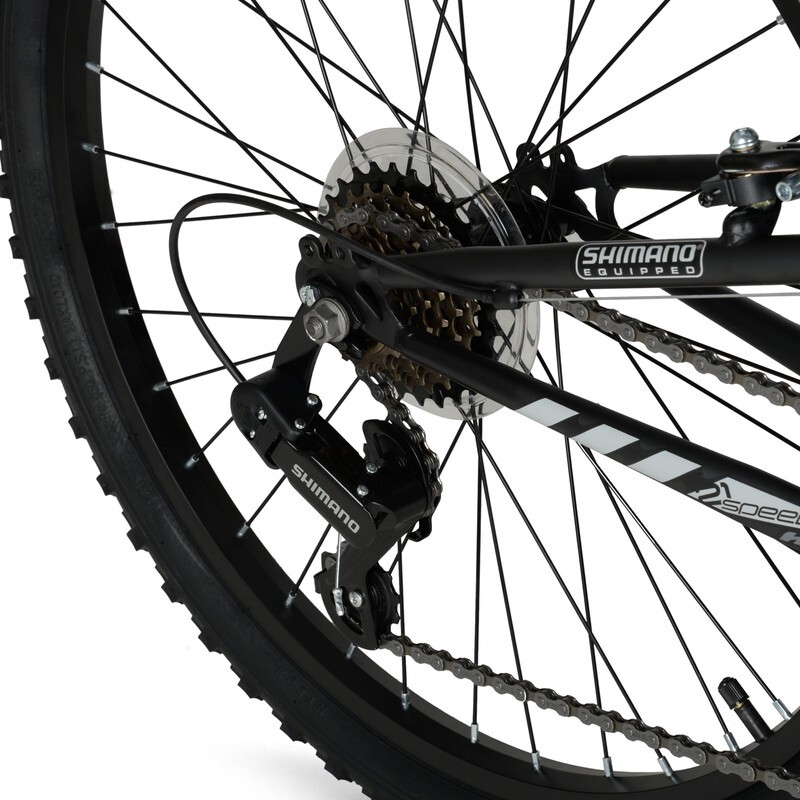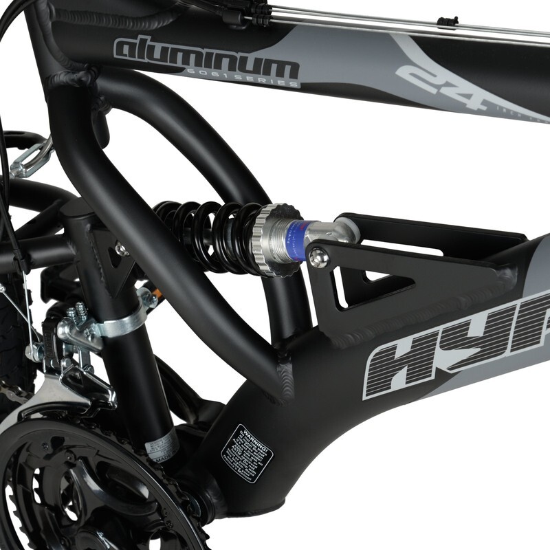This Hyper Bicycles Havoc boy's Mountain Bike is the key to outdoor fun. It has a lightweight aluminum frame that lets users ride harder for longer, providing a reliable experience. The 24" Hyper Bicycles Havoc is designed with a front and rear suspension to offer a smooth ride on any surface. It features 21 speeds, ensuring versatility in the ride. This mountain bike is equipped with Shimano twist shifter and a Shimano rear derailleur, allowing riders to change the gears quickly and smoothly. It has alloy rims and front and rear linear pull brakes. This bike is made with standard pedals for a comfortable and secure ride. It has grips on the handlebars for sustained comfort and control. Additionally, the bike comes equipped with a plush MTB seat, so backsides will stay comfortable on long rides. It has a sleek, black design that provides a modern look. The bike can be ridden on a variety of surfaces, allowing for flexibility in where you go with it. A bike for teens and adults.