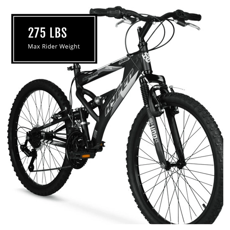 Durable Aluminum dual suspension frame Front suspension fork and rear coil shock 21 speed twist shifters with Shimano rear derailleur Front and rear linear pull brakes Alloy rims and three-piece cranks Max rider weight: 275 lbs Recommended Age Group: 10 to 14 Years Old Durable Aluminum Dual Suspension Frame Front Suspension Fork and Rear Coil Shock 21 Speed Twist Shifters with Shimano rear deraileur Front and Rear Linear Pull Brakes Alloy rims 2-Piece Cranks Max Rider Weight: 275 lbs Recommended Age Group: 10 to 14 Years Old Child, Youth or Adult Mountain Bike Hyper Bicycle Brand Character Group: Havoc