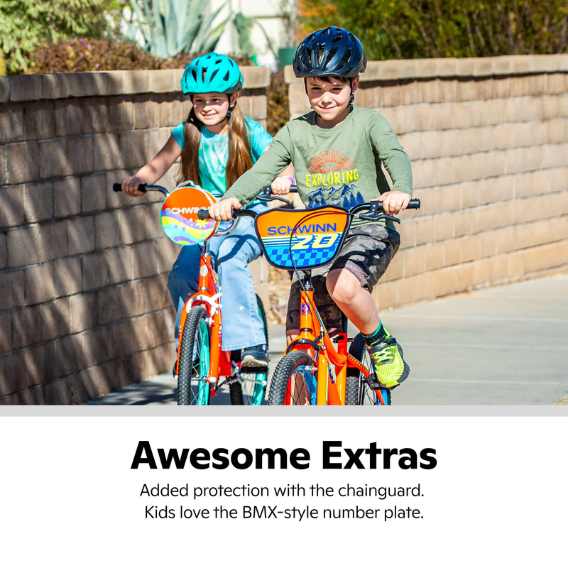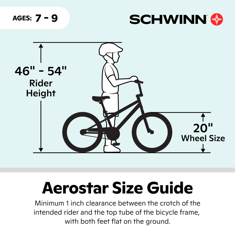 TRUSTED SCHWINN QUALITY: Trusted by parents, designed in Madison, Wisconsin. The Aerostar is a BMX-style kids? bike for teaching your little one to ride. 20-inch wheels fit riders 46 to 54 inches tall. MADE FOR KIDS: Growing riders deserve a bike made to fit them just right. The Aerostar incorporates a low standover height to make getting on and off the bike easier. And that makes for a more kid-friendly ride. SIMPLE BRAKING: Stopping is easy with the coaster brake, just pedal backward to stop. Plus, the handbrake eases the transition to a regular bike when they?re ready. GROWS WITH THEM: Tool-free adjustable seat allows the bike to grow with your child. AWESOME EXTRAS: Added protection with the chainguard. Boys love the cool BMX-style number plate. QUICK EASY ASSEMBLY: Assembles in minutes with the included tools and a simple instruction guide. They?ll be pedaling around in no time!