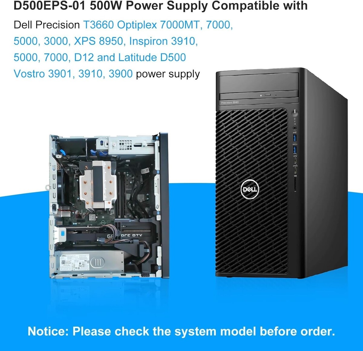 ?Compatible Models?D500EPS-01 500W Power Supply Compatible with Dell Precision T3660 Optiplex 7000MT, 7000, 5000, 3000, XPS 8950, Inspiron 3910, 5000, 7000, D12 and Latitude D500 Vostro 3901, 3910, 3900 power supply.