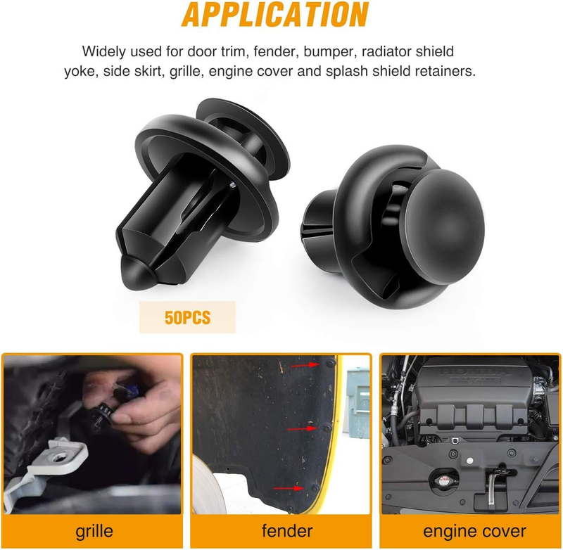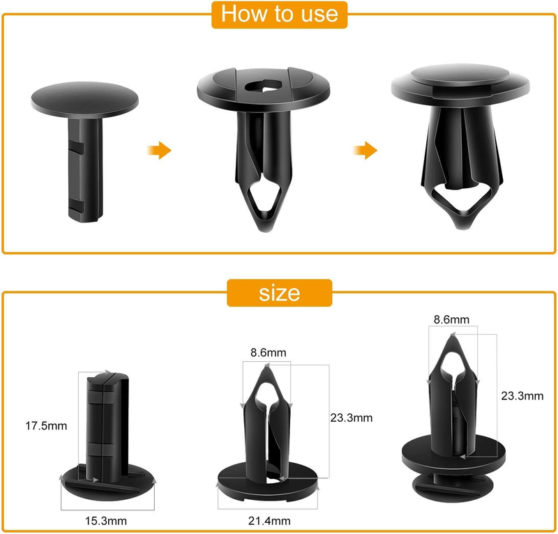 This 150-piece set includes durable push-type bumper fasteners, rivet clips, and a tough fastener removal tool, designed for easy installation and removal of automotive clips without damage. The fasteners are made from high-quality, impact-resistant nylon plastic, ensuring they won?t crack or break easily like other brands. The included fastener remover is crafted from a combination of durable plastic and metal, offering high abrasion resistance for effortless clip removal. These clips are widely used for securing door trim, fenders, bumpers, side skirts, and more. The set features two sizes: 100 universal 8mm clips (Head Dia: 20mm, Stem Length: 22.8mm) and 50 10mm clips (Head Dia: 20mm, Stem Length: 16mm). The package also includes a 5-inch fastener remover for added convenience
