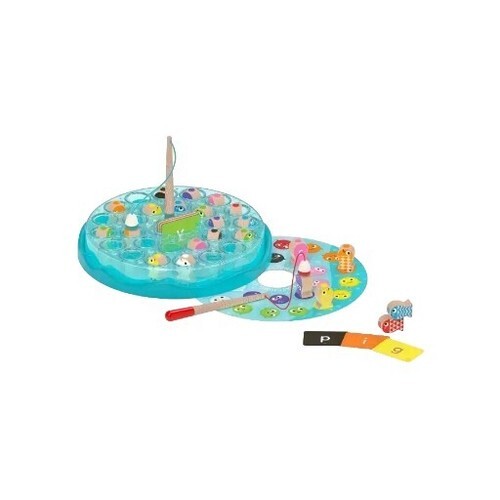 58-Piece Set: Go fishing with 26 wooden fish, 26 alphabet cards, 2 magnetic fishing rods, a spinning tray (2 pieces), a blank card, and a double-sided play board!