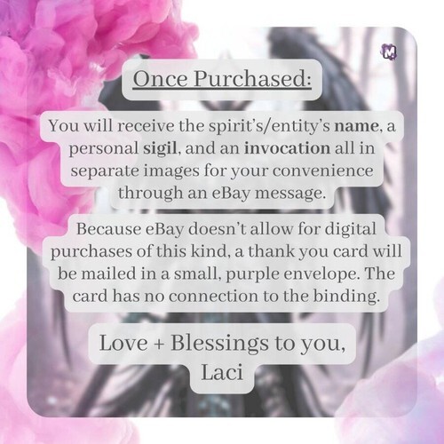 Once purchased, You will receive the spirit?s/entity?s name, a personal sigil, and an invocation all in separate images for your convenience through an message. Please give me some time in case I am asleep or otherwise occupied. I will send everything along as soon as I can.