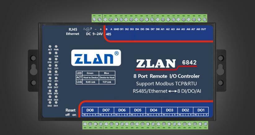 ZLAN6842: it?s an IO controller using Ethernet to control, the usually using communication protocol is Modbus TCP protocol, in this case the module converting protocol choose Modbus TCP to RTU, DI/DO/AI are corresponding to different register. If want to control through Modbus RTU protocol, set module converting protocol to ?No?, by using TCP to send Modbus RTU protocol can do the control. The product can conveniently and reliably though Ethernet to collect switch value, control relay, collect sensor.