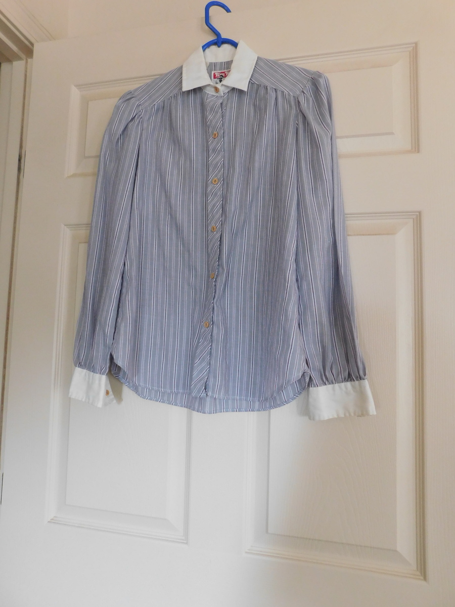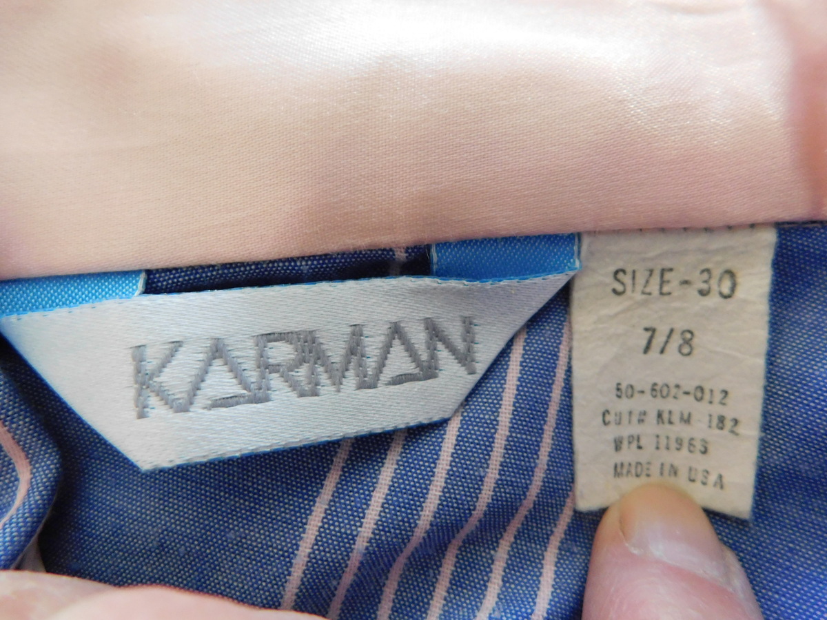 Karman, Size 7/8; 65% poly/35% cotton. Medium blue with pastel stripes. Snaps