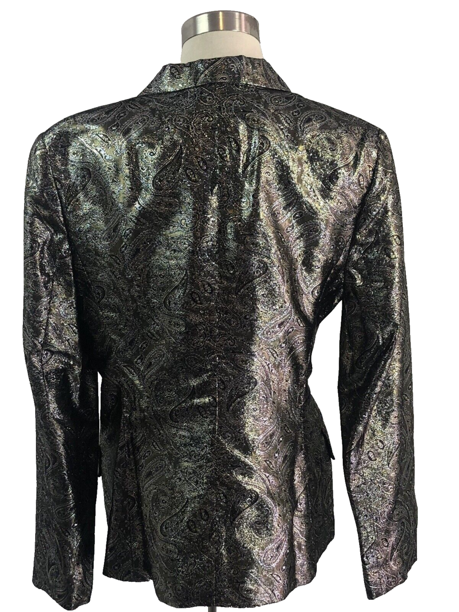 Nicole Miller Collection Green, Black, Gold, Silver Metallic Paisley Lined Blazer