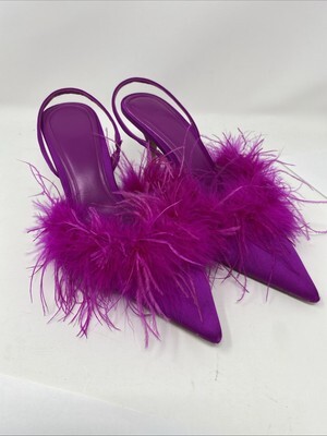 Zara Pink Satin Kitten Heel Sling Back Shoes Feathered Size 6