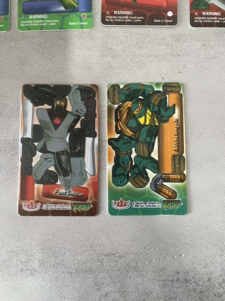 Lot of 10 Teenage Mutant Ninja Turtles collectible 3-D Pop-Out Trading Cards released in 2003 by Fleer. Each card set includes character pieces that pop out to assemble a 3-D figure with accessories.