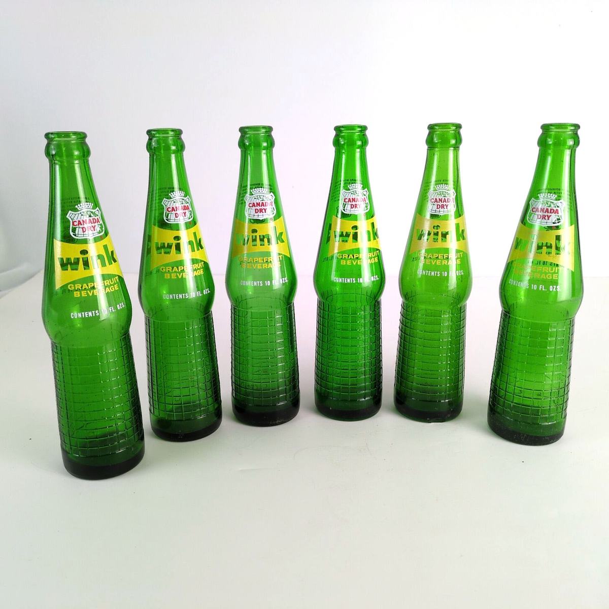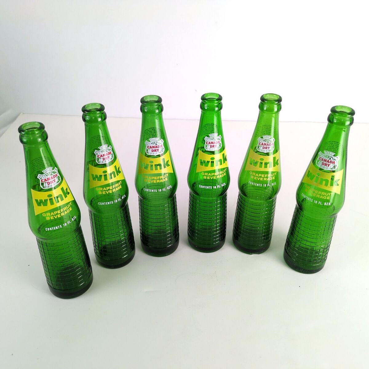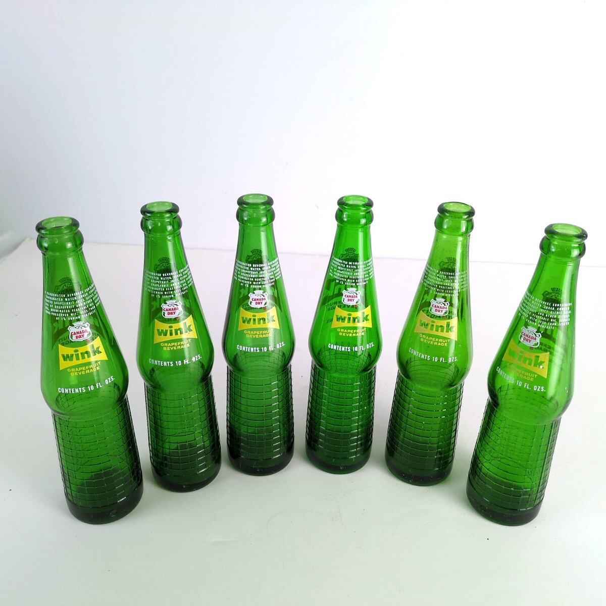 Set 6 Vtg Canada Dry Wink Grapefruit Beverage ACL 10oz Green Glass Soda Bottles