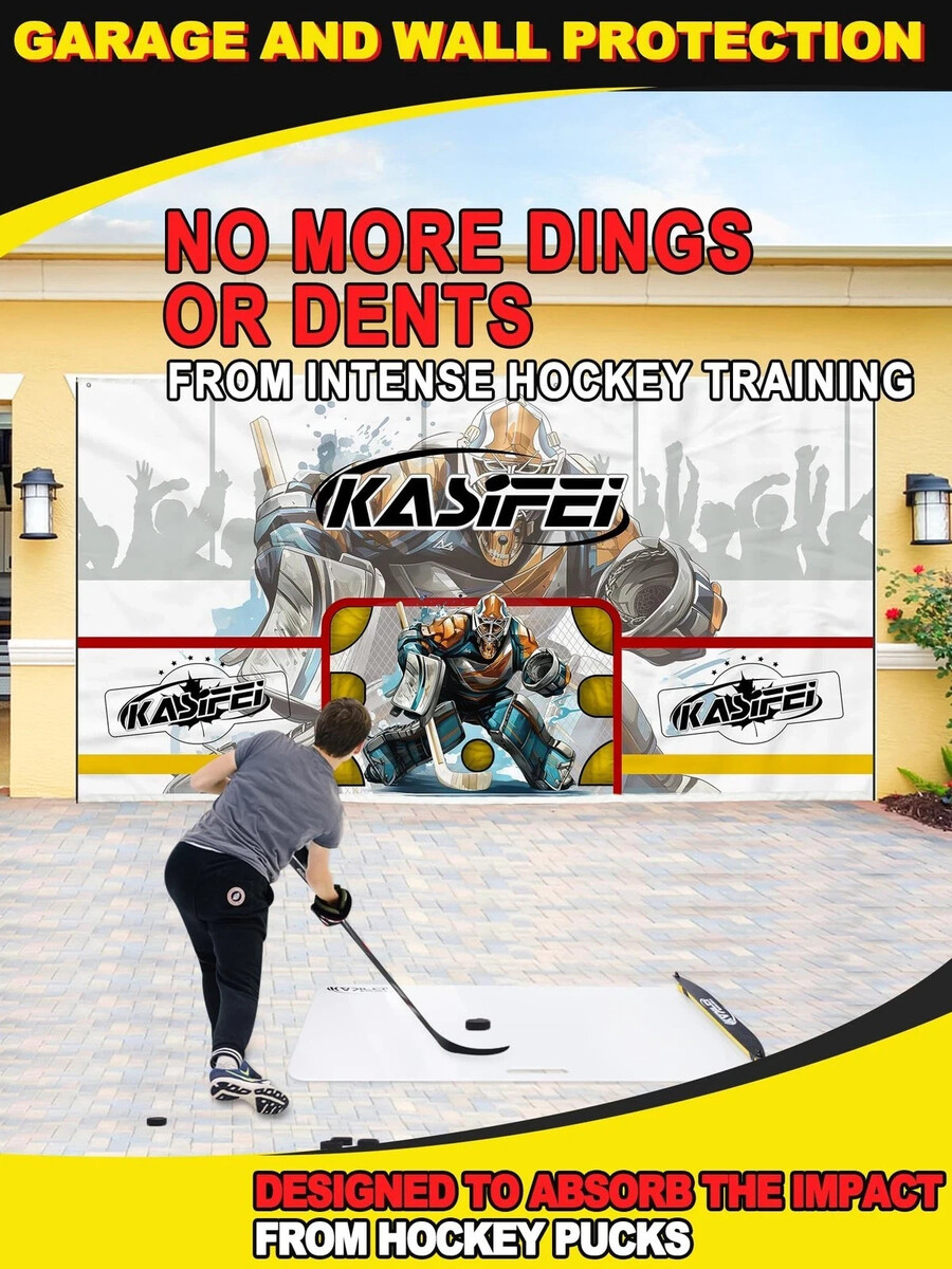Kasifei 16 x 8 ft Hockey Shooting Tarp made from heavy-duty Oxford fabric. Designed for players of any level looking to improve accuracy, shooting power, and consistency while protecting garage doors or interior walls from puck impact.