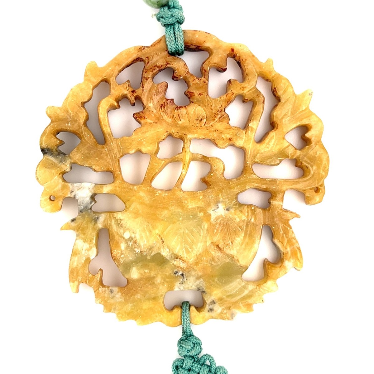 Chinesisches geschnitztes Jade-/Speckstein-Vielglück-Hangeornament aus Makramee. Wunderschon!