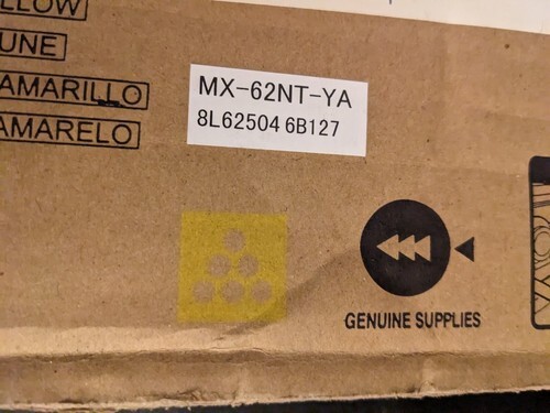Up for sale is a new in damaged box Genuine Sharp MX-62NT-YA MX62NTYA Yellow Toner Cartridge.