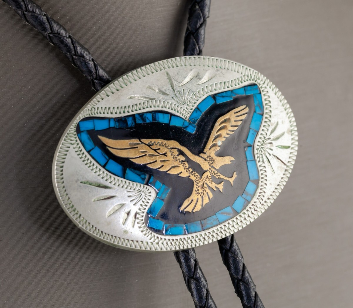 Sterlingsilber Sunburst Bolo Krawatte Mit Türkis Akcent Geflochten Leder