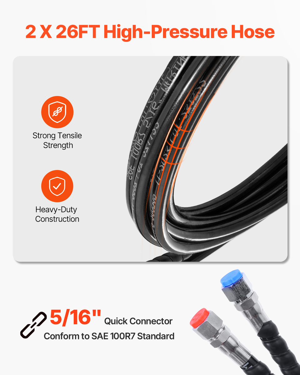 2PCS x 26FT Hoses: Equipped with quick-fit 5/16" fittings and compliant with SAE 100R7 standards, the 2PCS 26ft hydraulic steering hoses are designed to handle heavy loads without the risk of rupture or leakage. They provide long-lasting, efficient, and stable hydraulic oil transmission, ensuring a quick and reliable response to steering maneuvers.