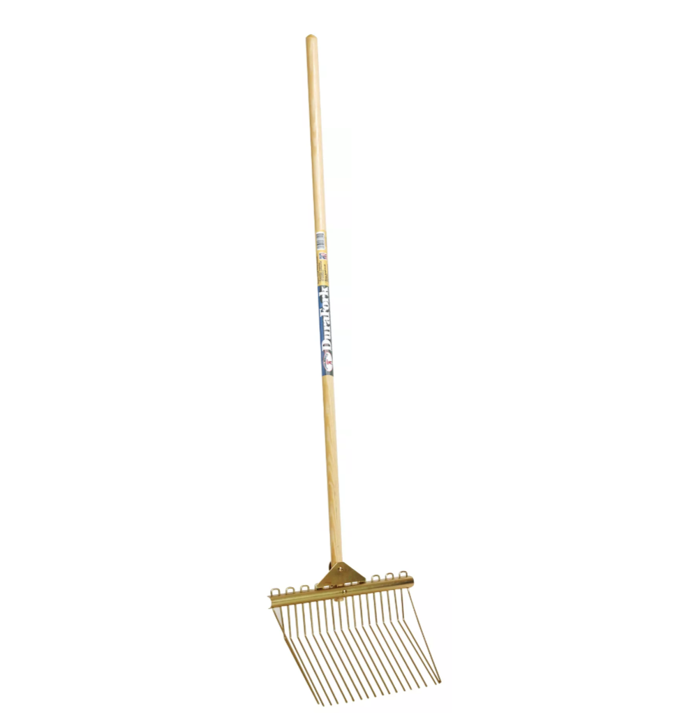 Extra strength and durability in the classic Little Giant Metal DuraFork bedding fork. Made of 18-gauge, corrosion-resistant yellow dichromate-plated steel, the manure scoop rake features a triangular support brace to prevent the fork head from coming loose. Specially designed tines are uniquely angled to provide easy manure pickup with less spilling. The manure rake's fork head is 11-3/8 in. long by 15 in. wide. It comes with a 52 in. by 1-1/8 in. (diameter) heavy-duty hardwood handle.