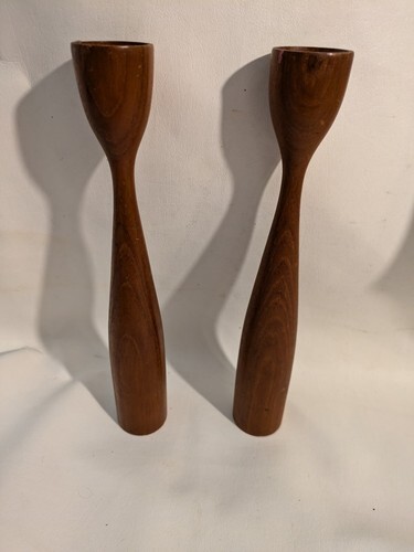 Vintage MCM 2 Teak Wood Tulip Candlestick Candle Holders Denmark 11.5 Inches