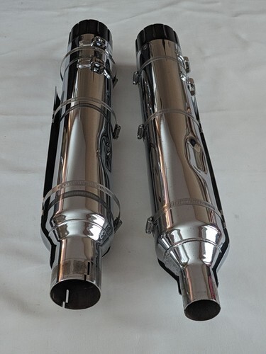 Enhance your Harley Davidson motorcycle's performance with these high-quality slip-on mufflers. The mufflers come in a sleek chrome finish and have black tips that add to the aesthetic appeal of your bike. These mufflers have a universal fitment, making them compatible with most street motorcycles. Crafted from durable stainless steel, these mufflers are easy to replace and feature a slip-on mounting style. The mufflers have an outlet diameter of 4 inches and a diameter of 1.75 inches and 2.5 inches. These mufflers are suitable for left and right rear placement on your motorcycle. Upgrade your motorcycle's exhaust system with these premium mufflers.