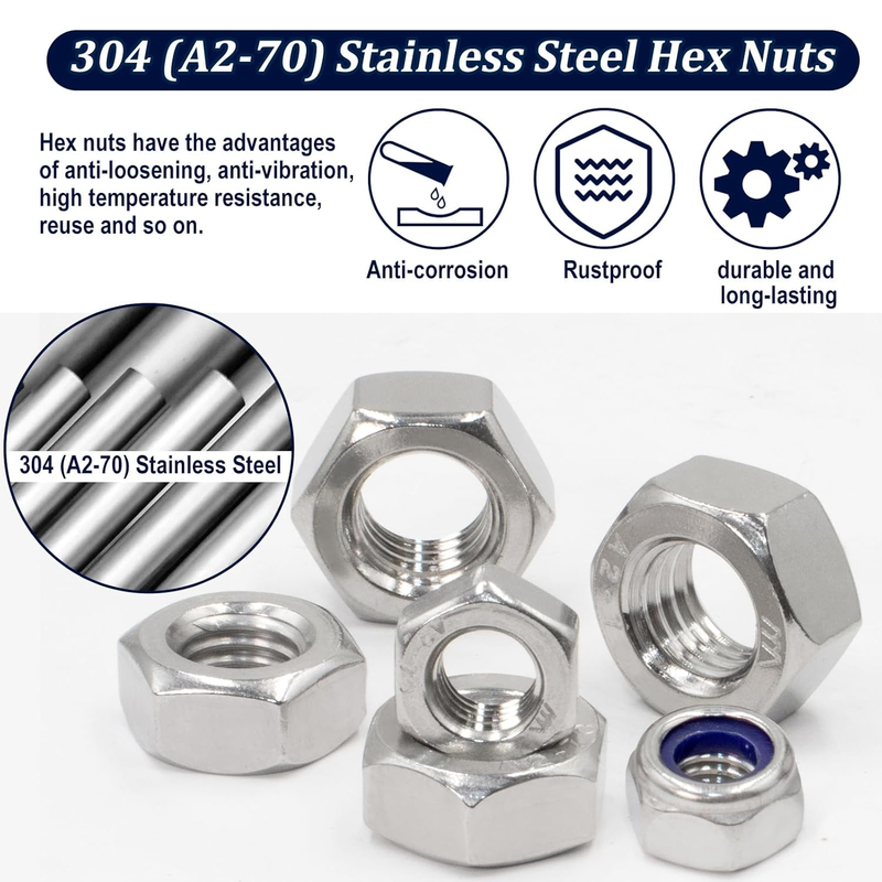 ? High-Quality 304 Stainless Steel: Made from durable 304 (18-8) stainless steel, these locknuts resist corrosion and oxidation, providing a longer service life compared to galvanized options.