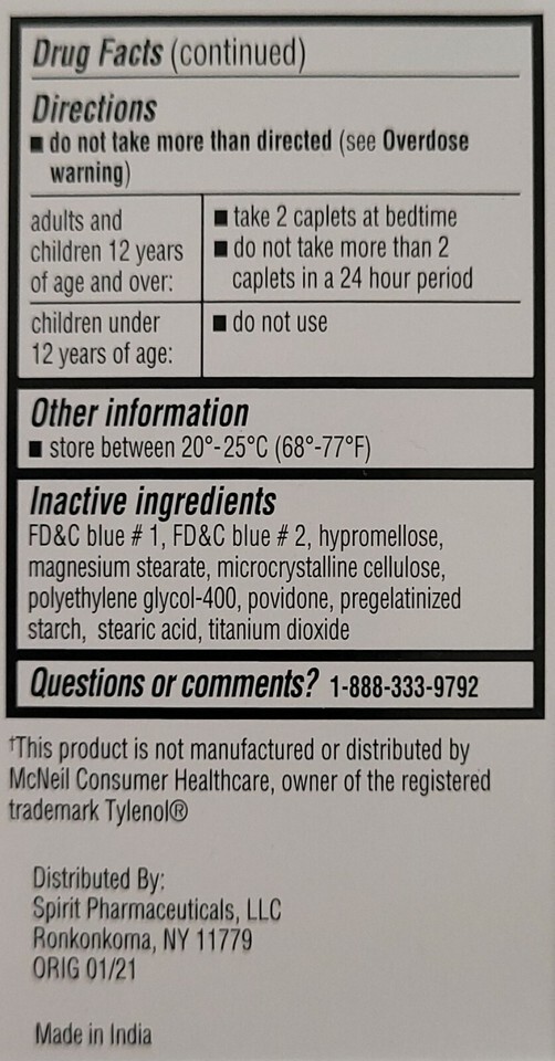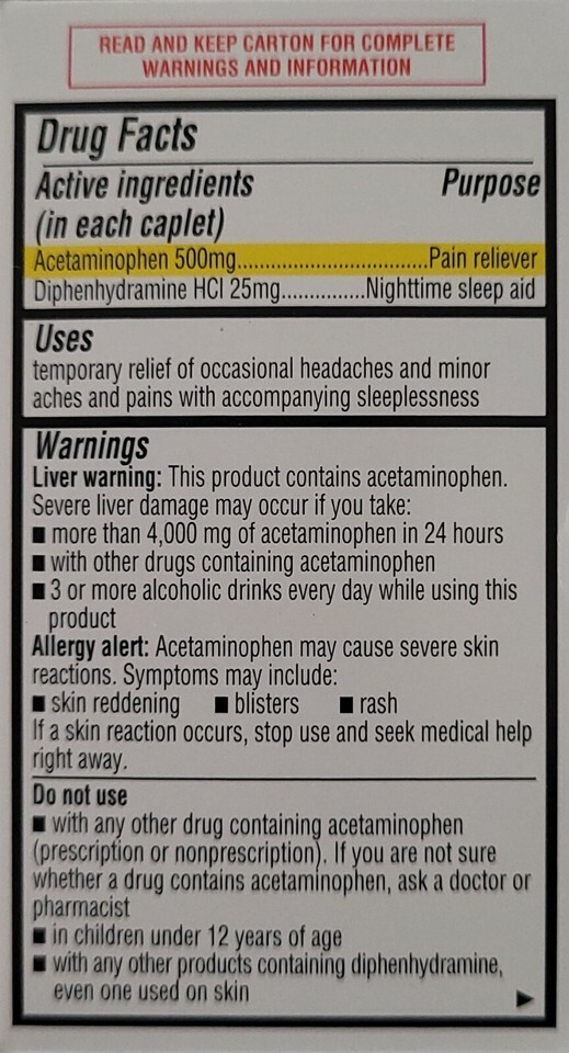 Each tablet contains 500mg of acetaminophen plus 25mg of Diphenhydramine HCI (a night-time sleep aid) for temporary relief of occasional headaches and minor aches accompanied by sleeplessness.