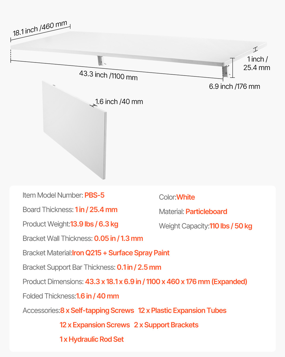 110 lbs High Load Capacity: Despite its compact size, this wall mounted desk holds up to 110 lbs thanks to its thick 1-inch material. It's stable for everything from small tools, large tools, laptops, and heavy books to decor items, ensuring everything stays steady.