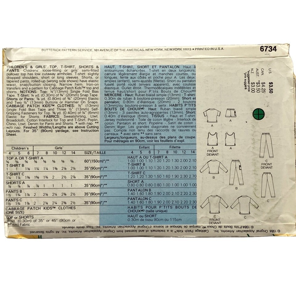 Butterick Cabbage Patch Kids 6734 Sewing Pattern Children's Girls Top Tshirt Short Pants Size 4-5-6
