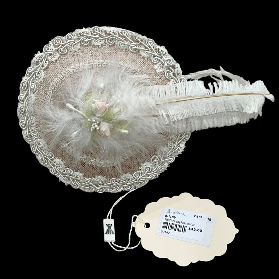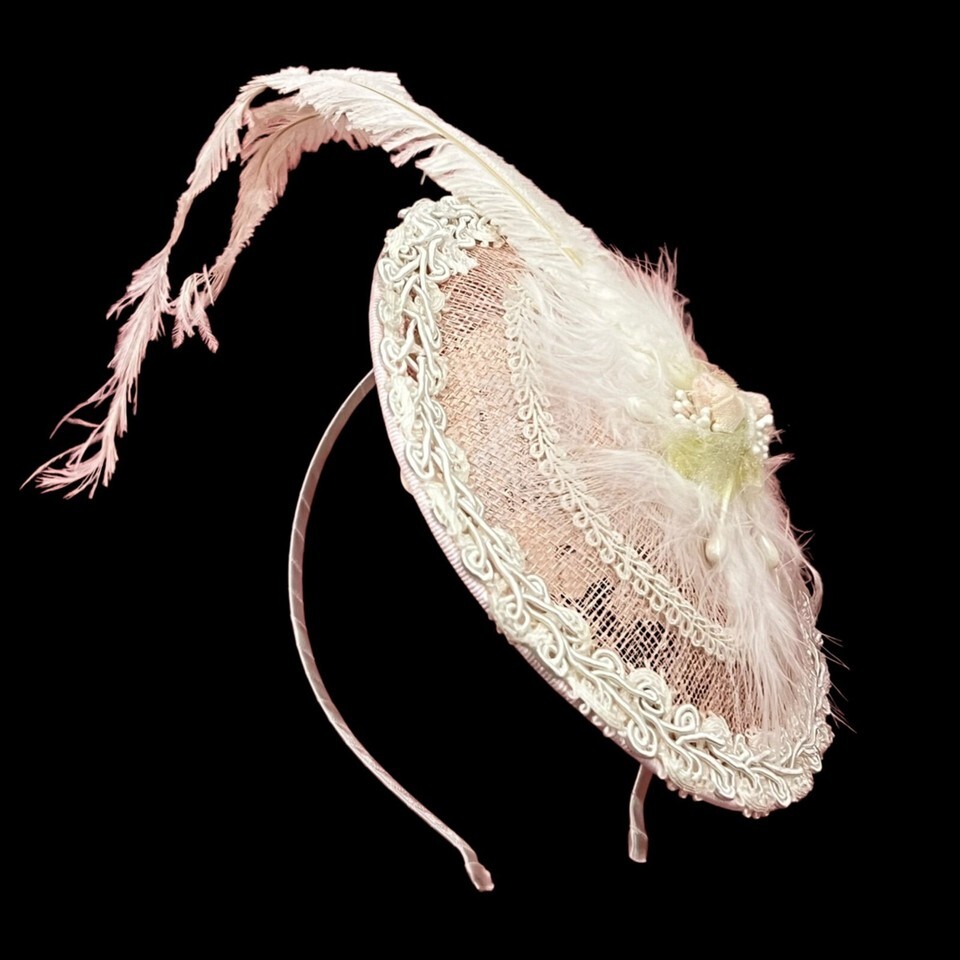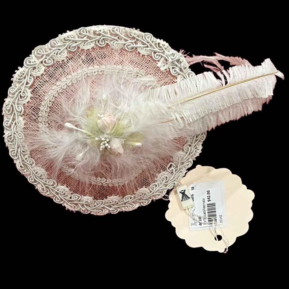 Elegant headpiece with pink lace, feathers, and floral accents. Feminine and stylish for formal occasions or dress-up events.