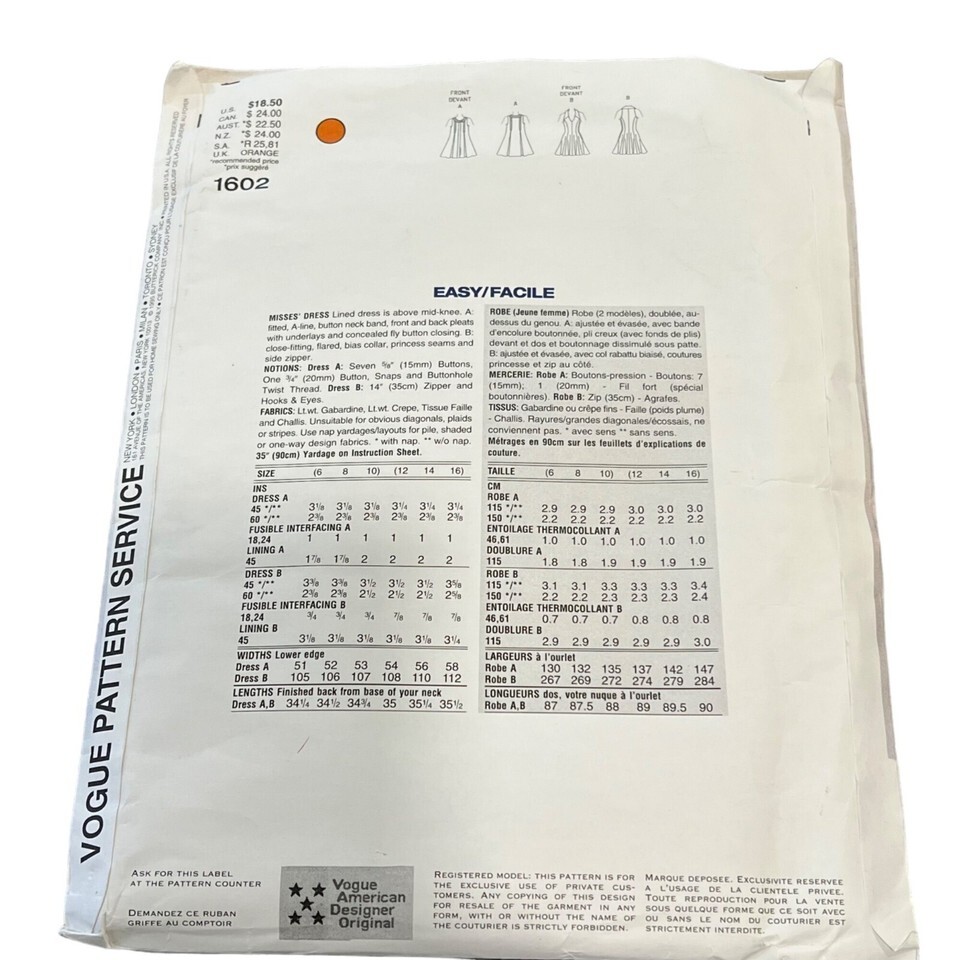 Vogue Patterns 1602 Anne Klein Womens Dress Sewing Pattern Size 6-10
