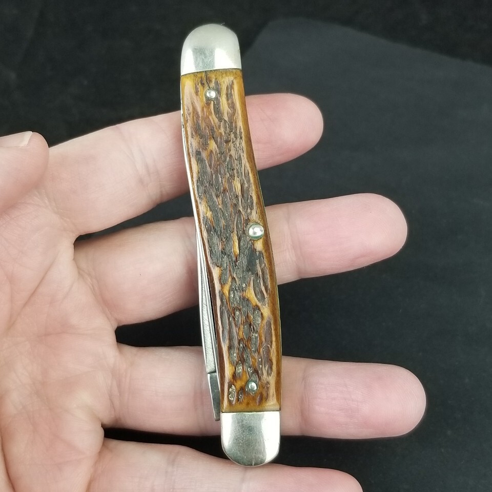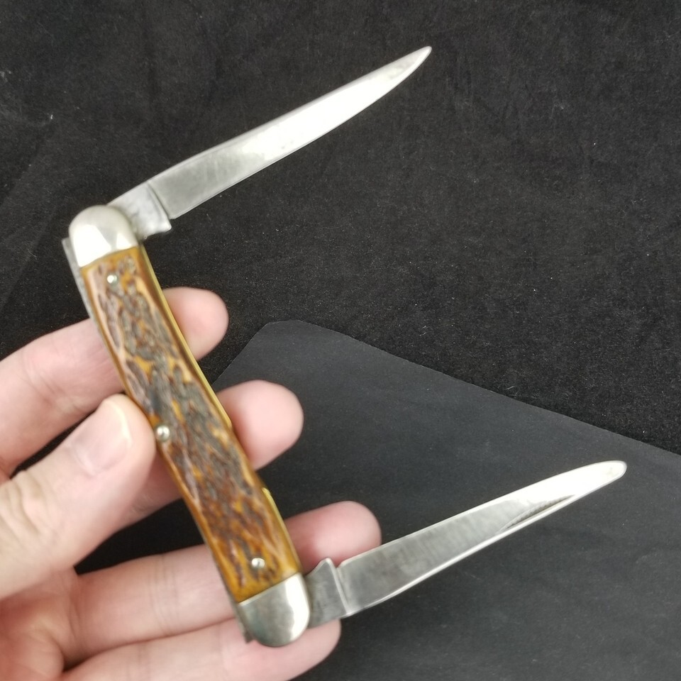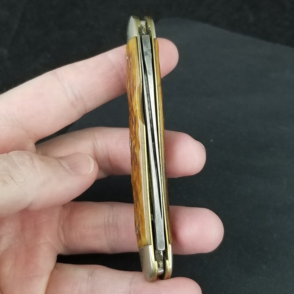 The outside of the knife is in GREAT condition. Scales, bolsters, and spine are all great. Both blades have fantastic snap on full open and close. Blades have some light signs of age. SEE PICTURES.