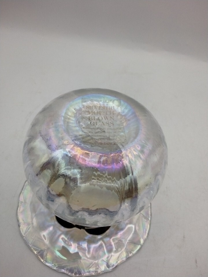 This is a vintage Silvestri vase made of iridescent clear glass, mouth blown in the United States. It has a metal collar and measures 5.25 inches in height and width at the lip of the vase. The base measures 4 inches. The vase is an original production of the brand and has a printed backstamp. It is a glossy finish and falls under the categories of Pottery Glass and Decorative Pottery Glassware. The vase is perfect for art enthusiasts and collectors.